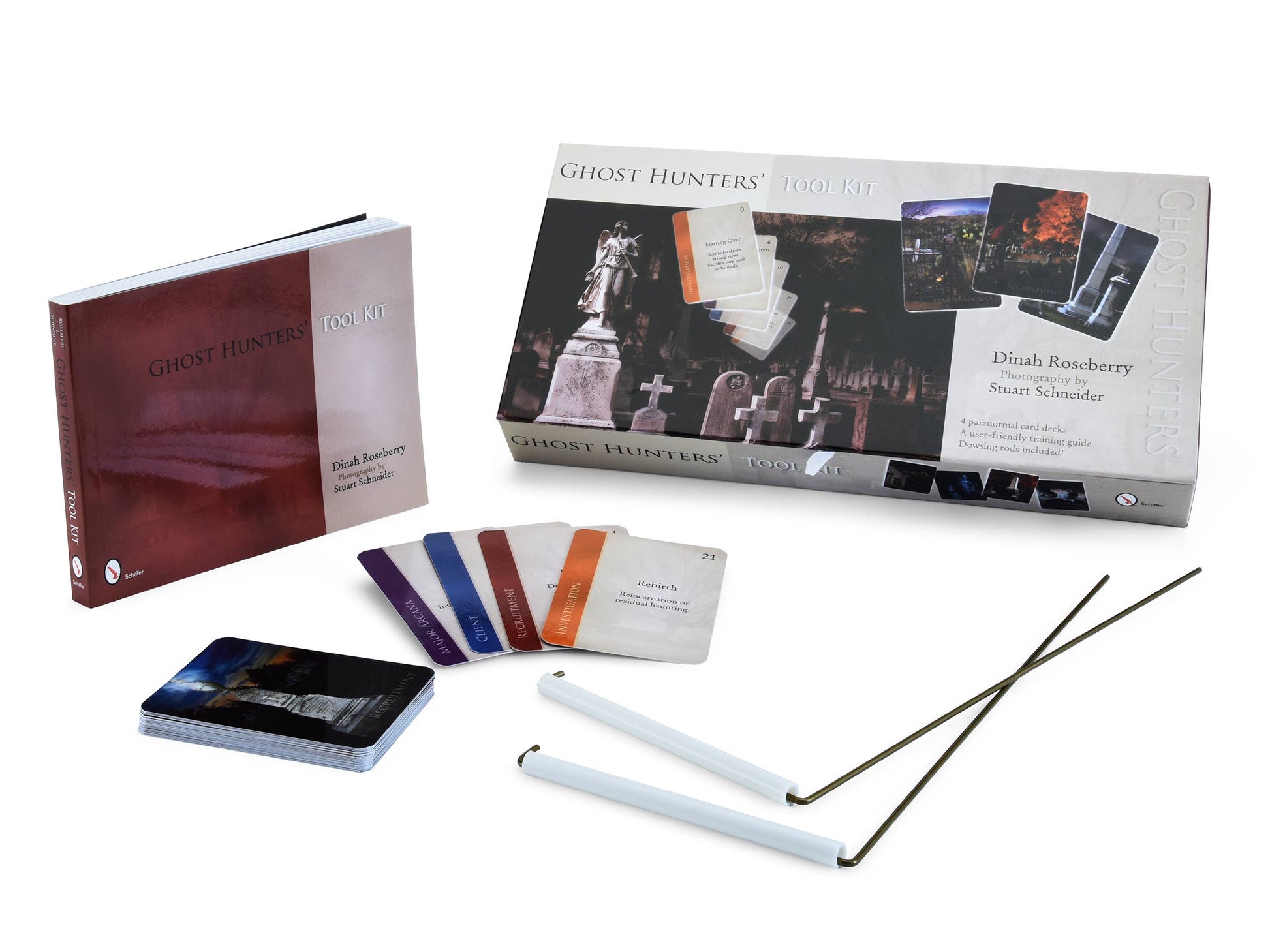 Use this paranormal tool kit to spark intuitive abilities and link them to scientific research. It offers assistance with client interaction, member recruitment, and paranormal research by using four 22-card decks designed specifically for ghost investigations and paranormal studies. See how intuition and brainstorming techniques can be used by your team to answer questions that can help solve cases. Get more information from your clients, find the right members for your group, and make EVP or ITC sessions more successful as you conduct your investigations. Included are dowsing rods to further enhance divination skills and a ghostly version of the Major Arcana Tarot. If you're new to the paranormal field, try your hand at starting your own team with this easy-to-follow kit! Includes cards and book. Includes cards, book & dowsing rods.